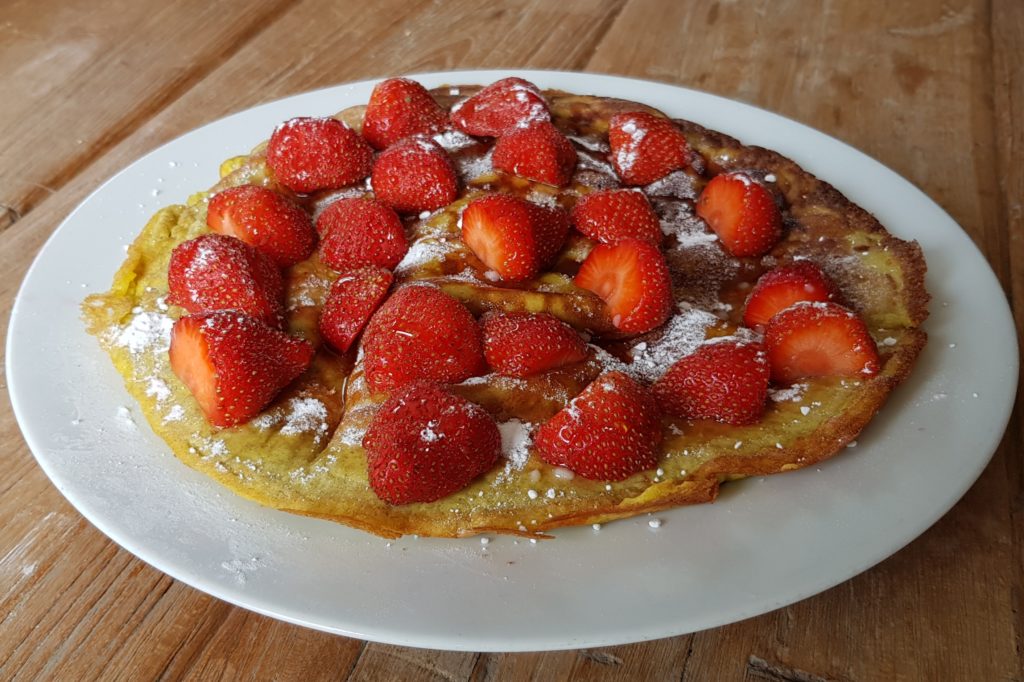 Deze zeer eiwitrijke aardbeien pannenkoek met 41 gram aan eiwitten is een perfect gerecht voor mensen die vet willen verliezen en spieren willen behouden.